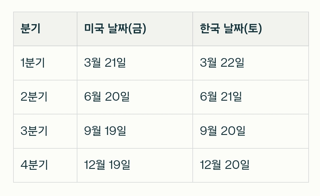 미국에서는 매년 3월, 6월, 9월, 12월의 세 번째 금요일에 '네 마녀의 날'이 있습니다. 2025년에는 3월 21일, 6월 20일, 9월 19일, 12월 19일에 해당합니다.