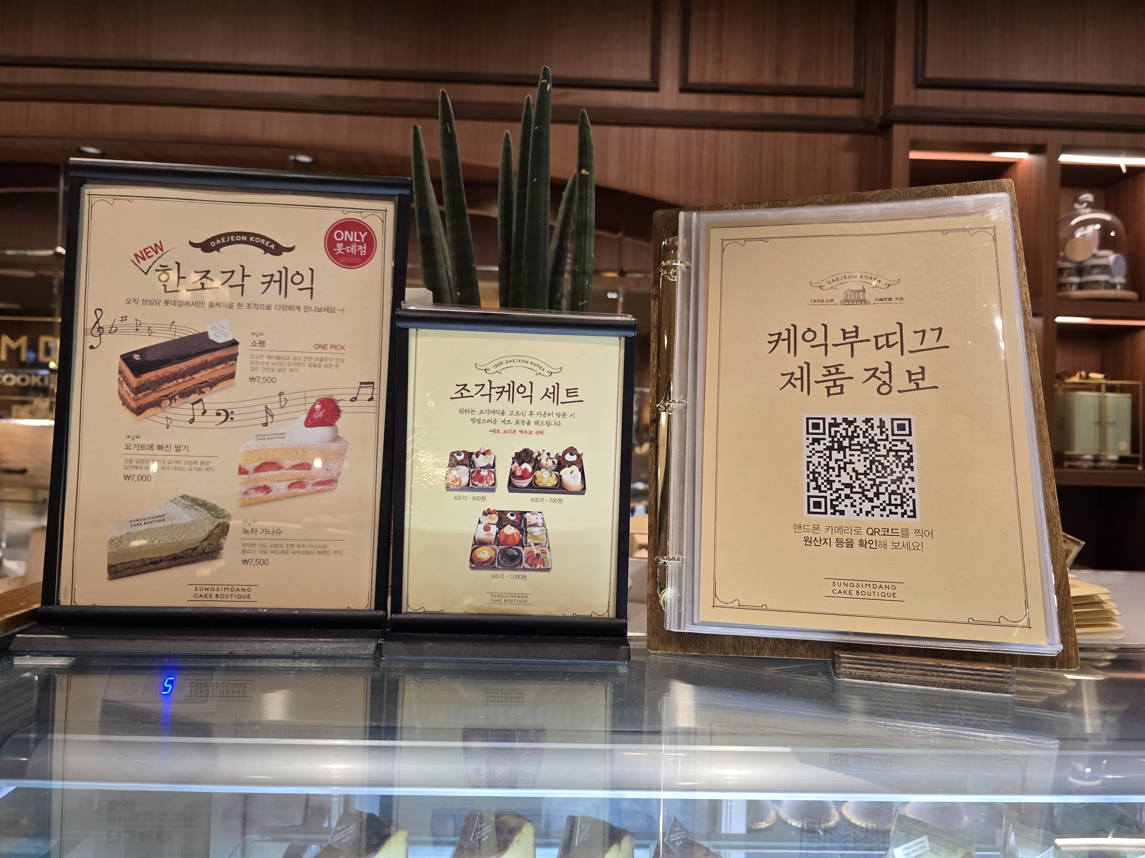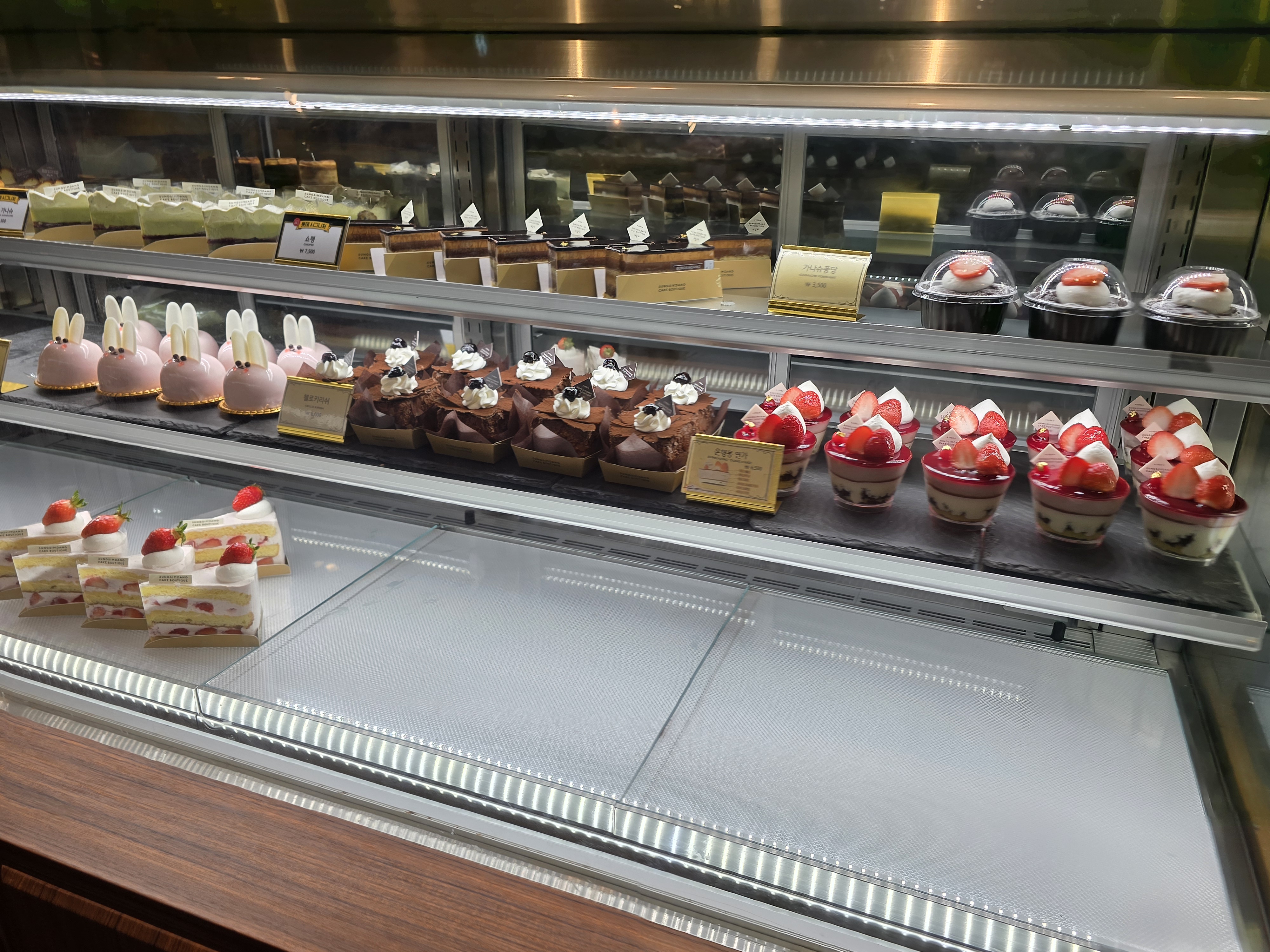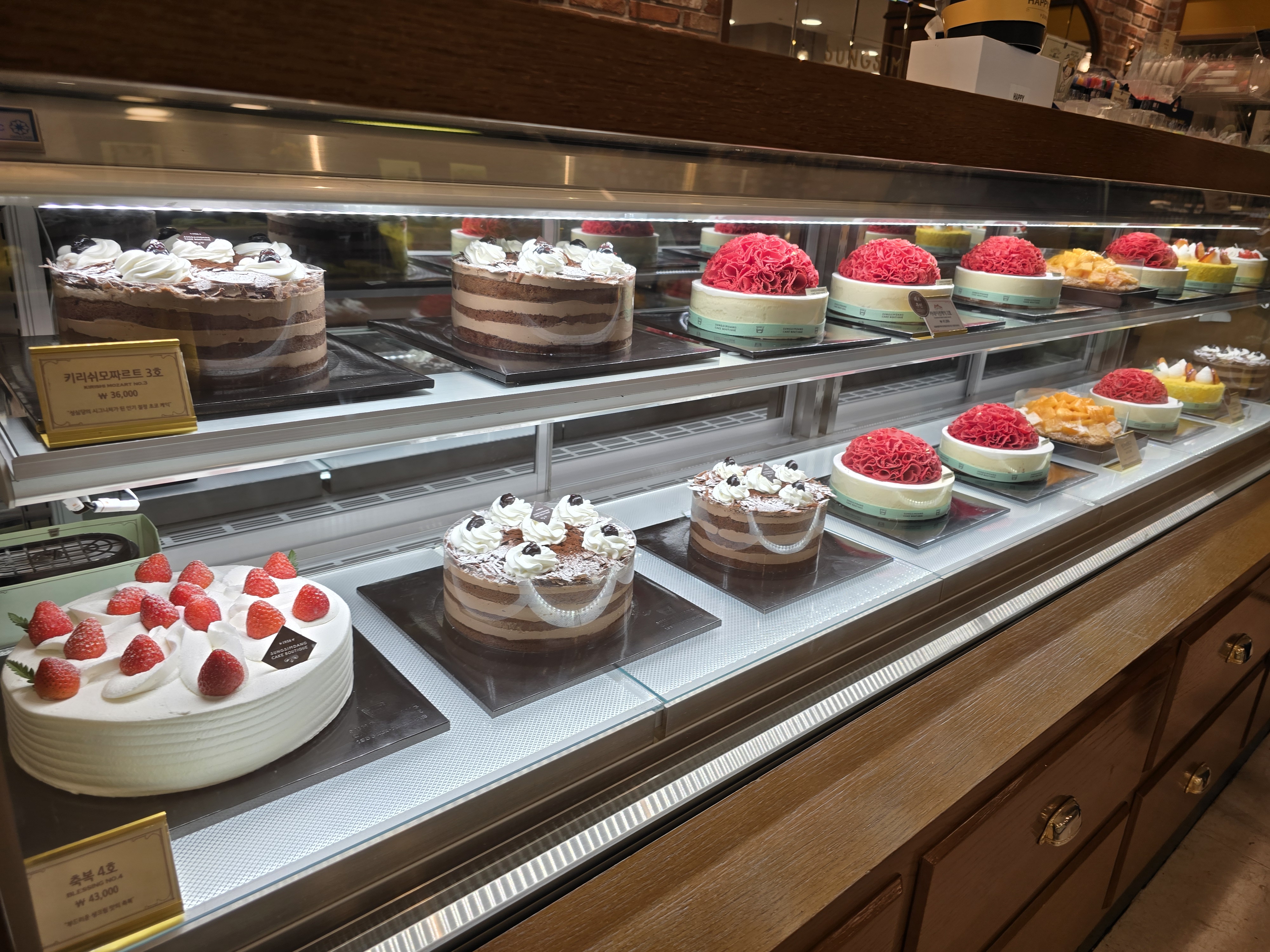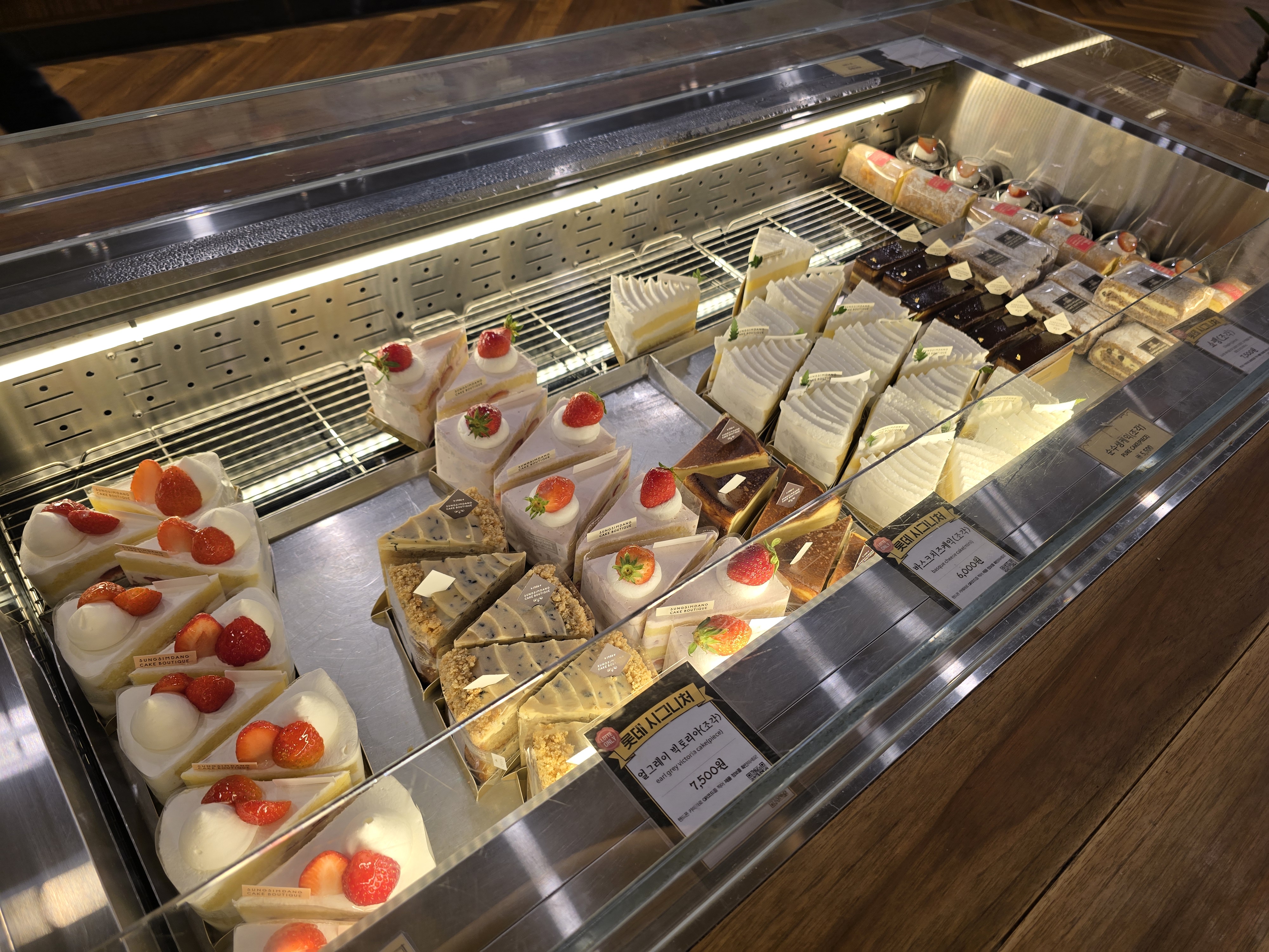 매장은 기존 성심당 빵코너와는 완전히 분리된 독립된 공간으로, 프리미엄 디저트샵이라는 정체성이 느껴지도록 인테리어도 차분하고 고급스럽게 꾸며져 있었어요. 유리 진열장 안에는 크고 작은 케이크들이 예술작품처럼 전시되어 있었고, 디스플레이 하나하나에서 정성이 묻어났어요. 무엇보다 조명과 케이크의 색감 조화가 정말 예뻐서 사진 찍기에도 딱 좋았어요.