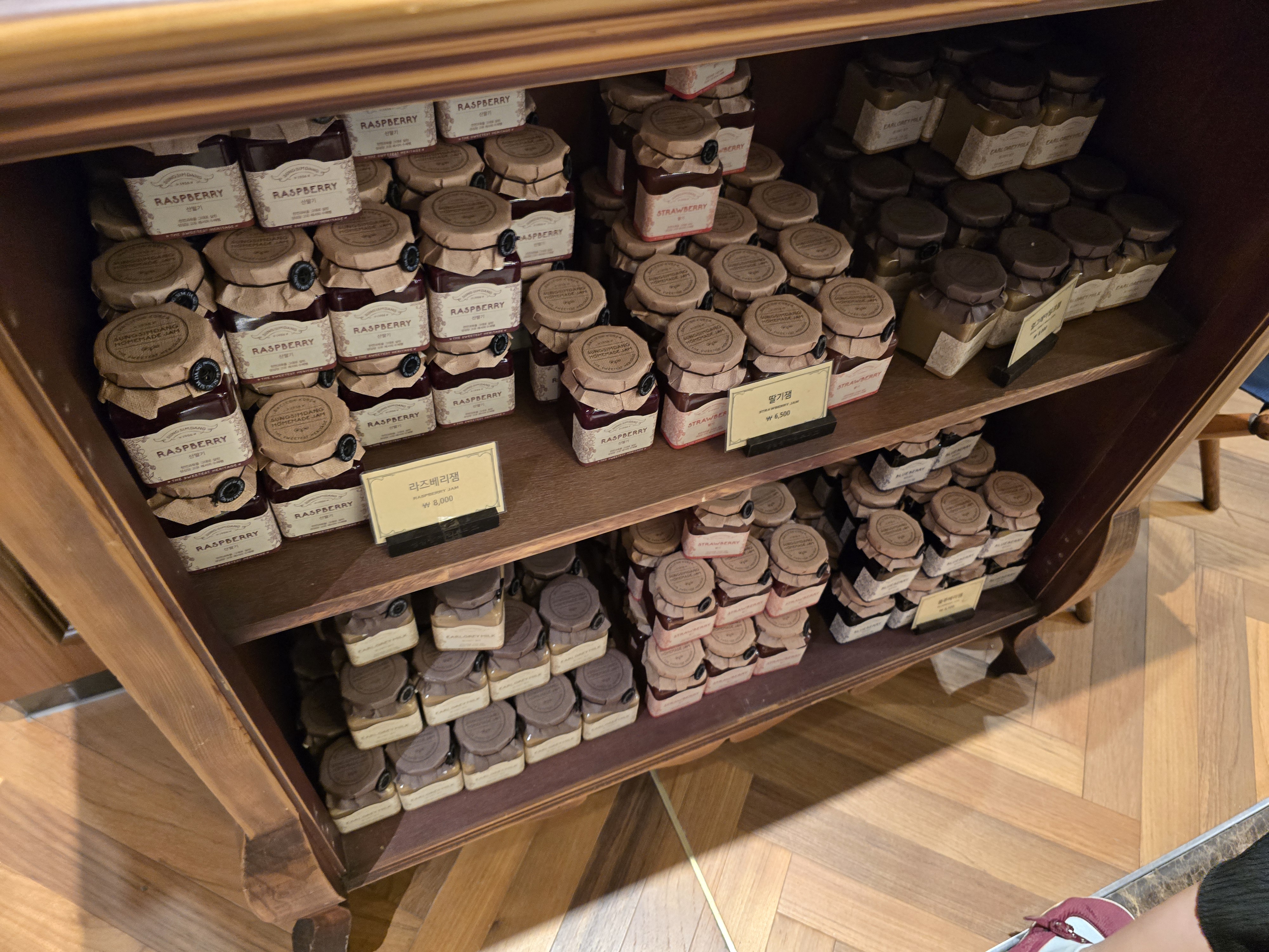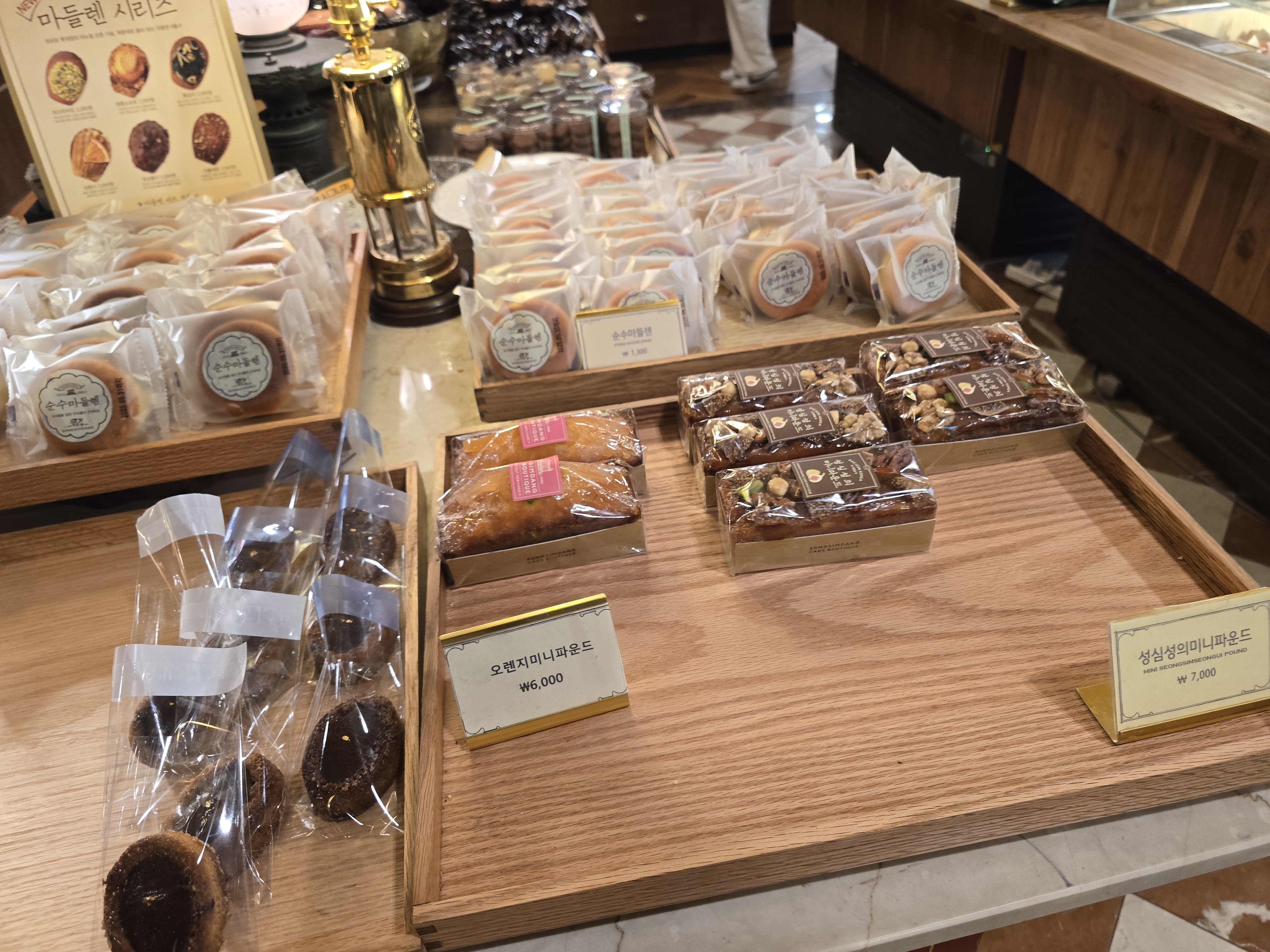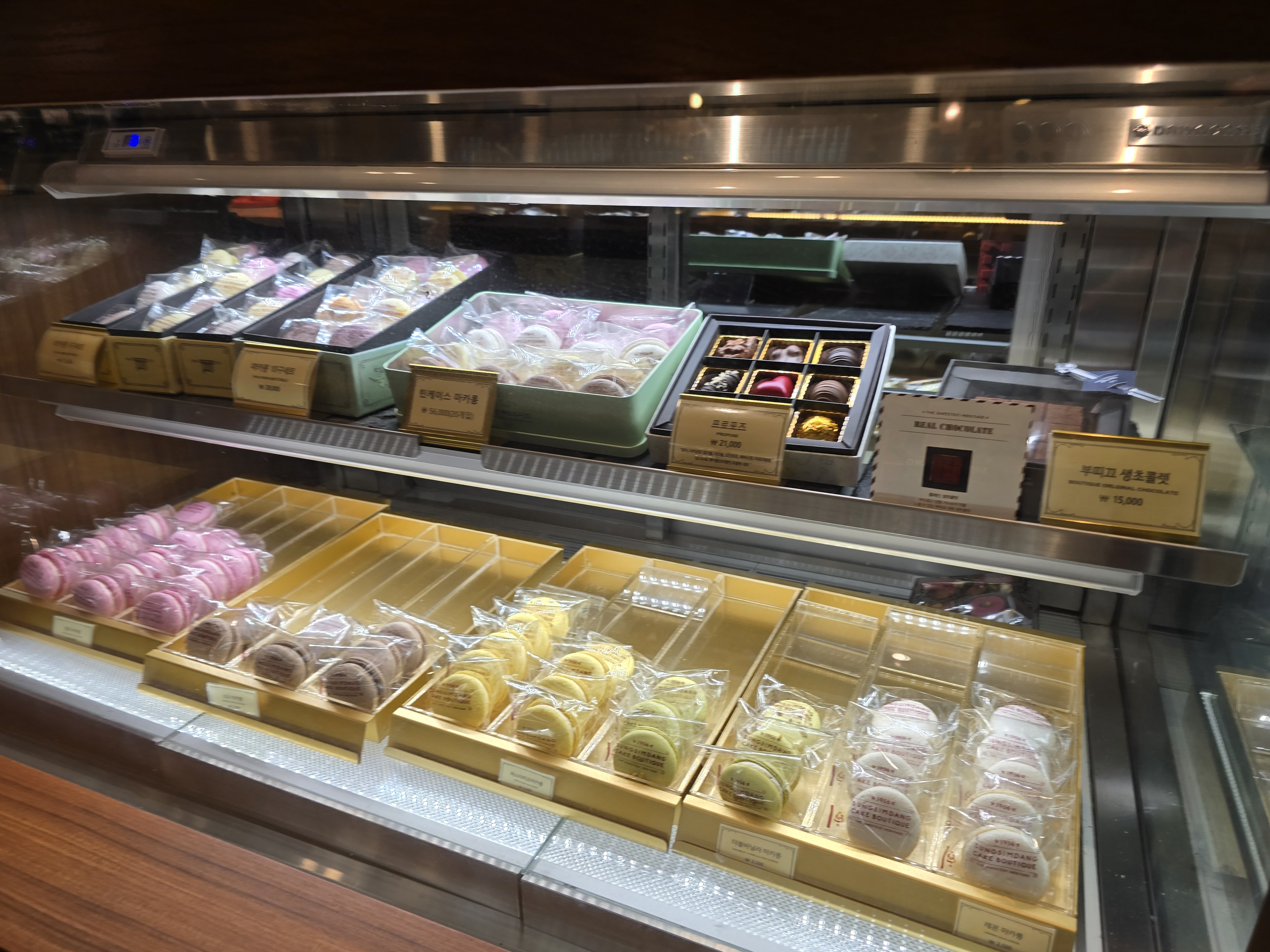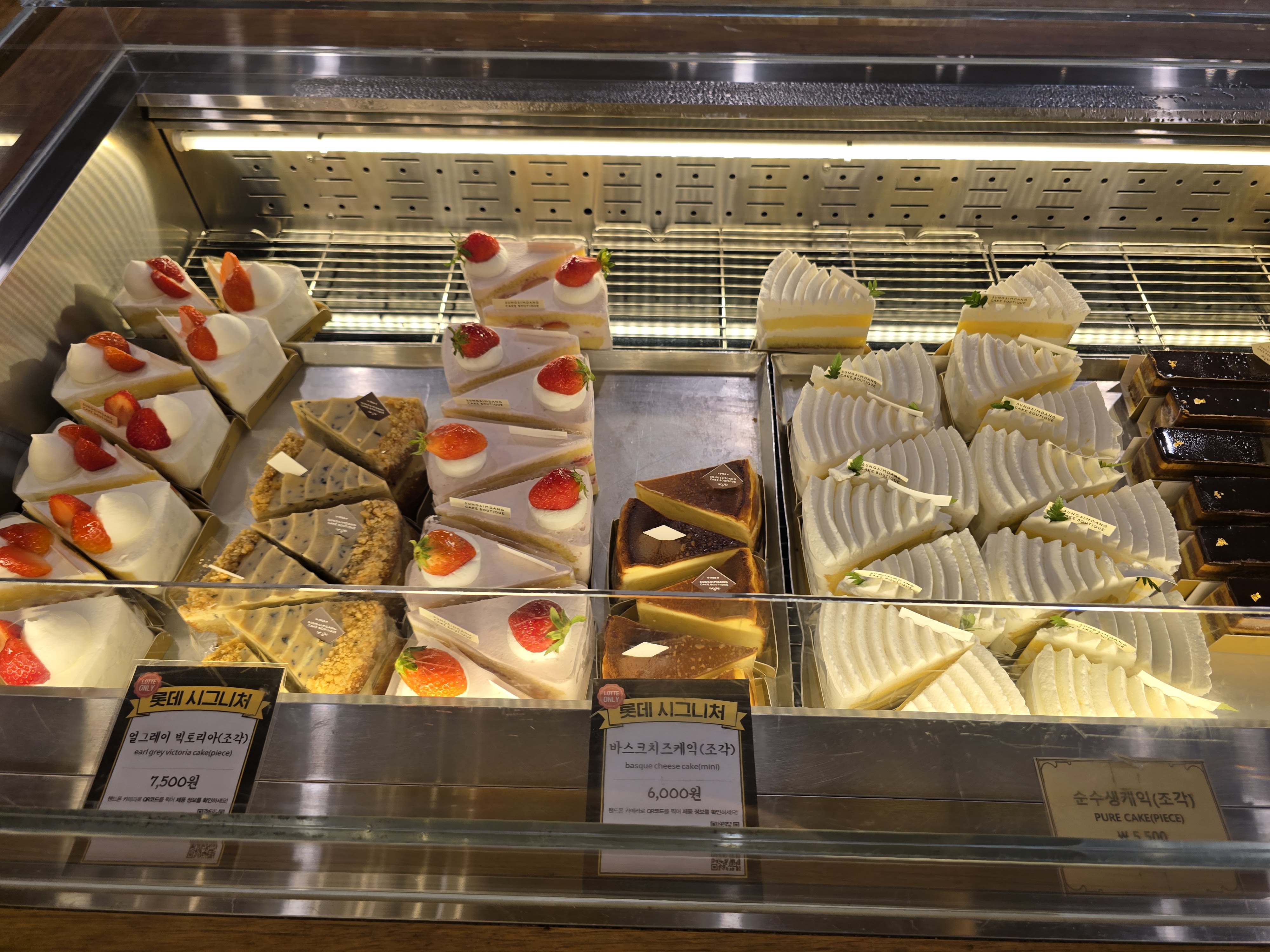매장은 기존 성심당 빵코너와는 완전히 분리된 독립된 공간으로, 프리미엄 디저트샵이라는 정체성이 느껴지도록 인테리어도 차분하고 고급스럽게 꾸며져 있었어요. 유리 진열장 안에는 크고 작은 케이크들이 예술작품처럼 전시되어 있었고, 디스플레이 하나하나에서 정성이 묻어났어요. 무엇보다 조명과 케이크의 색감 조화가 정말 예뻐서 사진 찍기에도 딱 좋았어요.