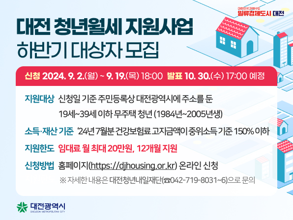 2024 대전 청년 월세 지원사업 안내신청기간 2024년 9월 2일(월) 09:00 ~ 9월 19일(목) 18:00 선정발표 2024년 10월 30일(수) 17:00 예정 지원대상 신청일 기준 대전시 거주, 19세 ~ 39세의 무주택 청년 가구 ※