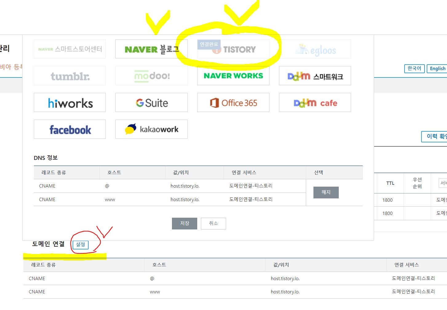 이때 가비아 홈페이지를 열어두고, 연결할 사이트 또한 함께 열어두셔야지 설정을 하기가 쉽습니다. 동시변경진행을 해주세요. 아래의 사진처럼 변경페이지의 중앙 부분에 보면 도메인 연결 '설정'을 눌러보시면, DNS정보와 함께 바로연결이 되는 연계 사이트들이 배너로 보이게 됩니다.