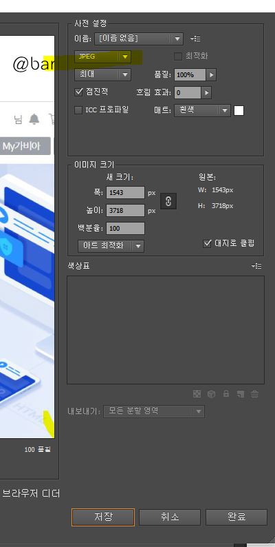 웹으로 저장하기는 디자인을 했던 파일을 JPG, PNG로 재저장 할 수 있고