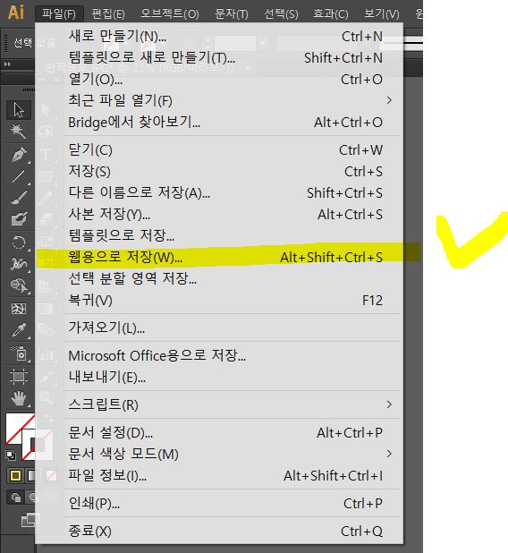 일러스트 상단 바에서 맨 앞에 위치한 '메뉴'를 눌러서 11번째에 위치해 있는 웹용으로 저장을 클릭해 줍니다.