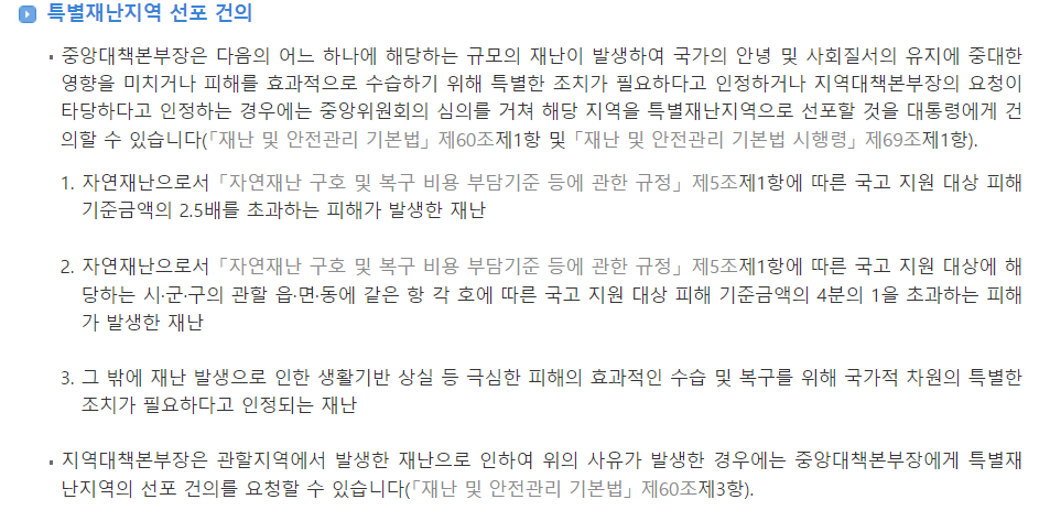 중앙대책본부장은 다음의 어느 하나에 해당하는 규모의 재난이 발생하여 국가의 안녕 및 사회질서의 유지에 중대한 영향을 미치거나 피해를 효과적으로 수습하기 위해 특별한 조치가 필요하다고 인정하거나 지역대책본부장의 요청이 타당하다고 인정하는 경우에는 중앙위원회의 심의를 거쳐 해당 지역을 특별재난지역으로 선포할 것을 대통령에게 건의할 수 있습니다(「재난 및 안전관리 기본법」 제60조제1항 및 「재난 및 안전관리 기본법 시행령」 제69조제1항).
