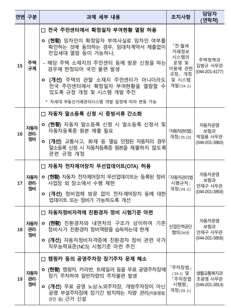 이외에도 토지이용·건축규제, 자동차 관리·정비 등 국민의 건의가 있었던 국토·교통 분야의 규제 16건도 개선할 예정이다.