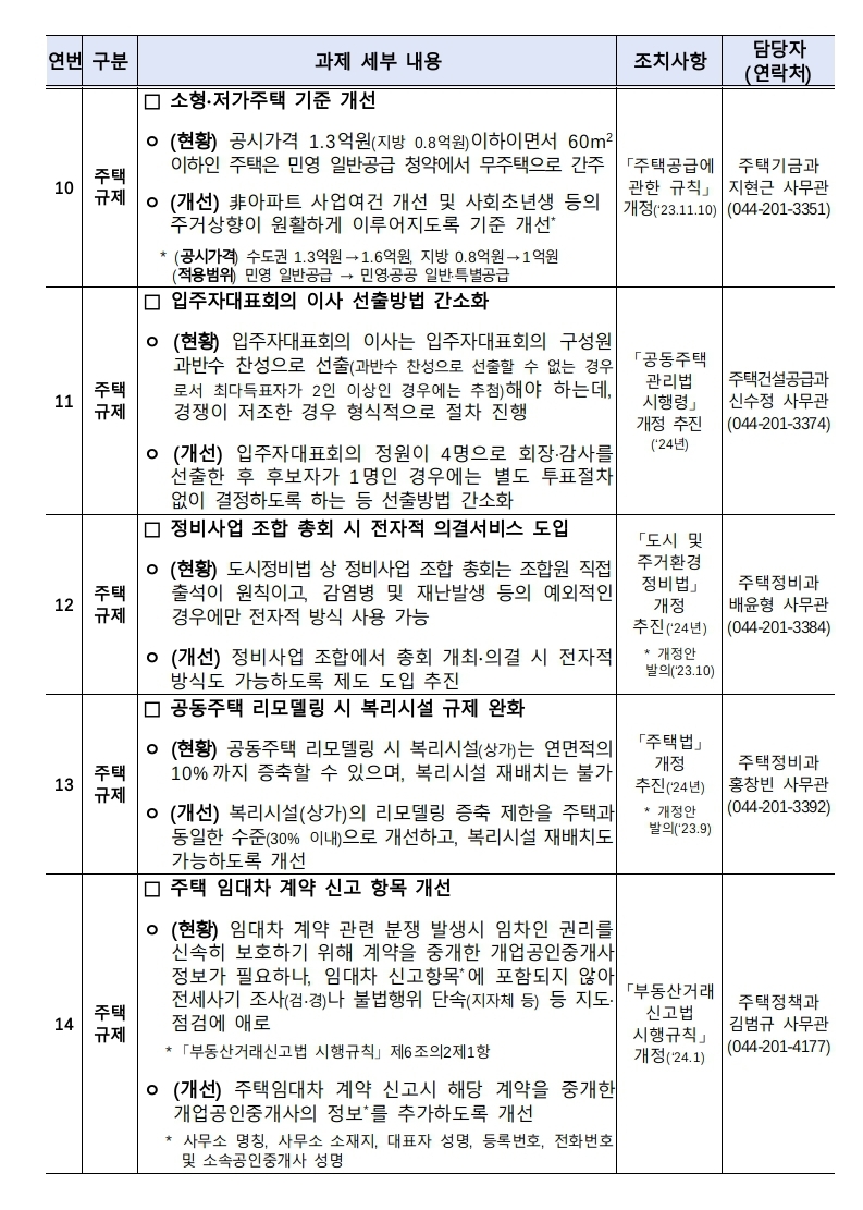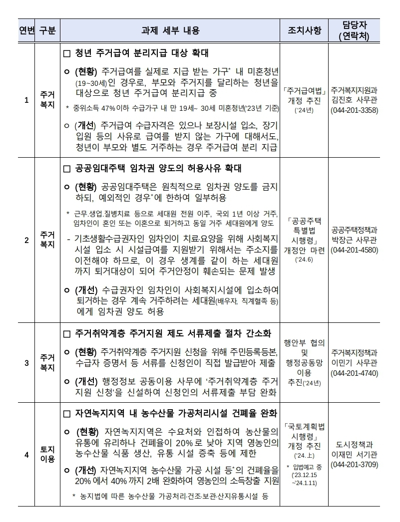 ㅇ 이번 규제개선 과제에는 주거복지 분야가 중점적으로 반영되어 있어 저소득층 등 주거약자의 주거 여건이 개선될 것으로 기대된다.