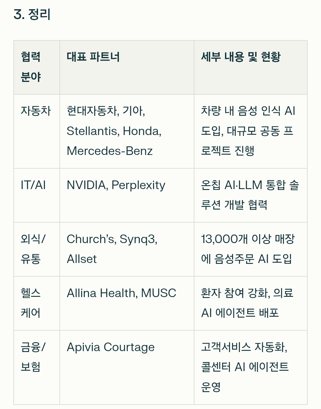 • 헬스케어: 2025년 6월, 미국 Allina Health와의 제휴로, 의료 분야에서도 A 음성 에이전트를 확대배포하고 있습니다. 이를 통해 환자 참여 및 의료 서 비스 간소화에 기여 중입니다 4 5